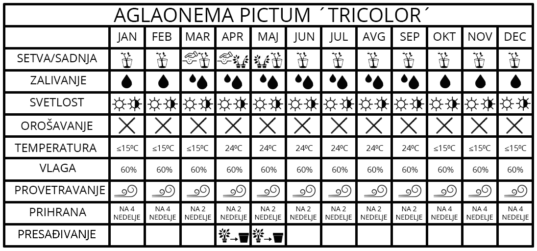 Aglaoneme su vrlo zahvalne zimzelene sobne biljke koje su vrlo pogodne za uzgajivače početnike. Vole toplotu i vlagu, pa je u letnjem poeriodu pogodna temperatuta od 24°C kao i visoka vlažnost. Zimi je najbolje čuvati ih na 15°C, ali mogu i da podnesu temperature do 10°C. U našim uslovima aglonema naraste oko 25 cm. Pogodna je za terarijume i dobro se uklapa sa većinom sobnih biljaka.