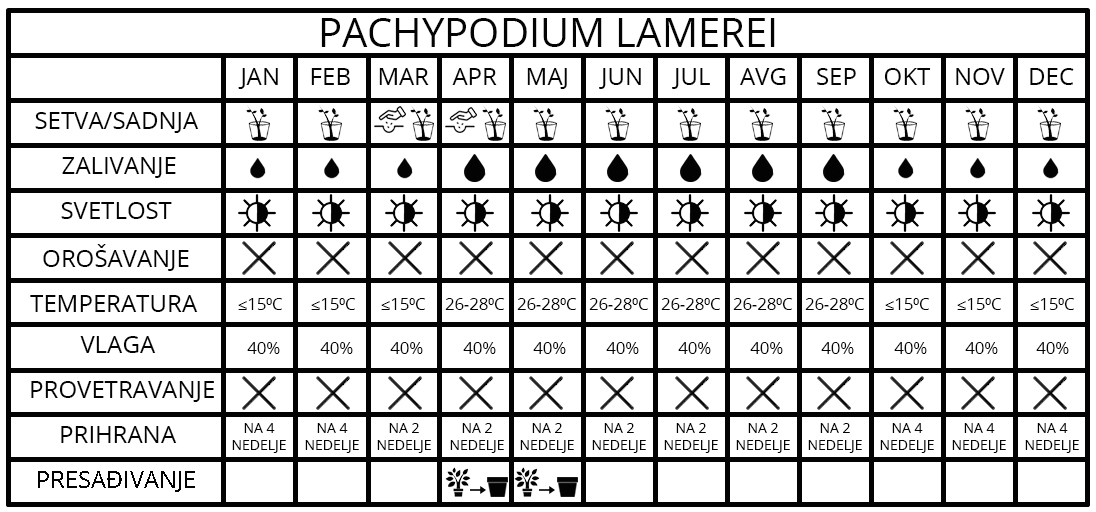 Madagaskarska palma, kao što samo ime kaže, nam dolazi sa Madagaskara i pripada porodici Apocynaceae. Okarakterisana je kao sukulenta i svoje rezerve vode čuva u mesnatoj stabljici tako da nema velikih potreba za vlagom.
